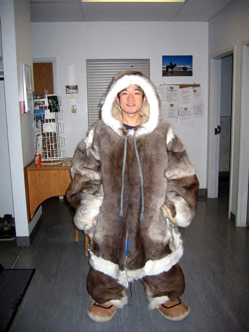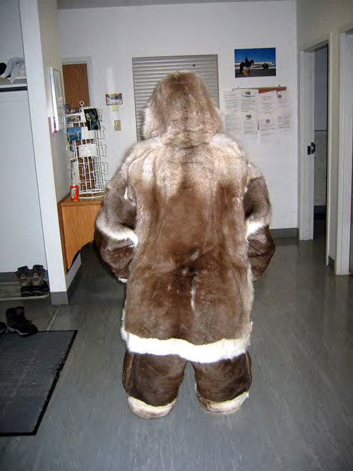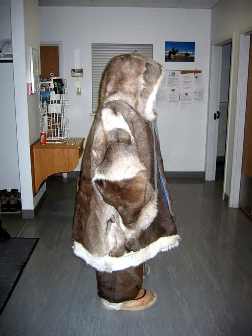 これは、前がファスナーになっている。伝統的なイヌイットの形はプルオーバー(頭からかぶって着る)タイプである。