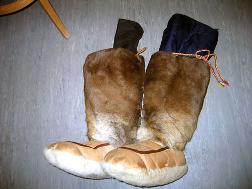 全部で、3重になっている。ブーツの底は羊毛で甲の部分が羊皮、すねまでの部分がアザラシの皮である。