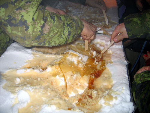 作り方は、雪の上にメイプル・シロップをたらし、その上にまた雪をかぶせてしばらく置くととても冷たくなり、粘りも硬くなる。
