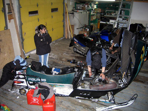 スノー・モービルを修理するイヌイット、彼らは器用に何でもこなす。