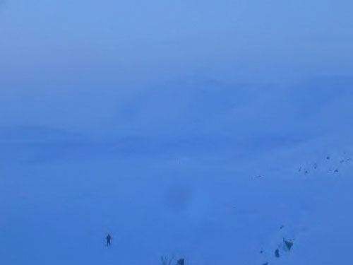 ルート・ハンティングから戻る大場 深雪と急峻な山に妨害され断念せざるをえなかった(ピックアップ前)
